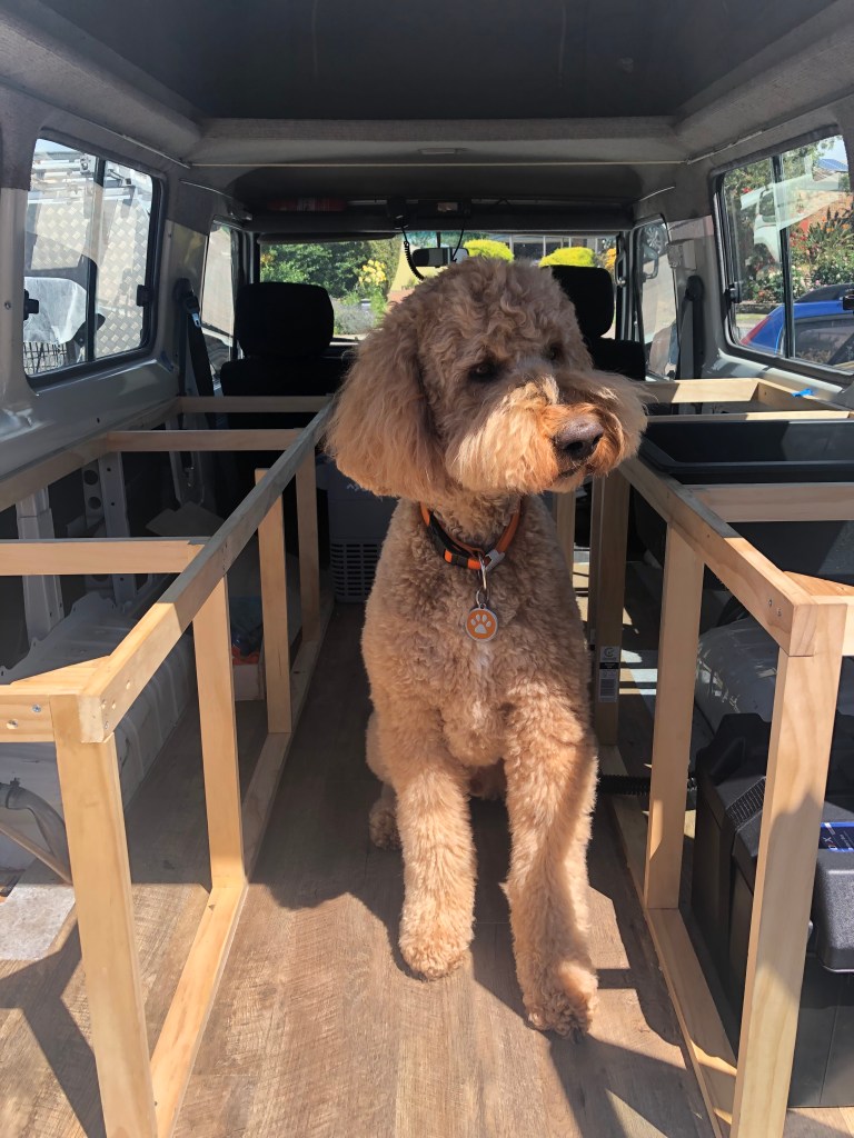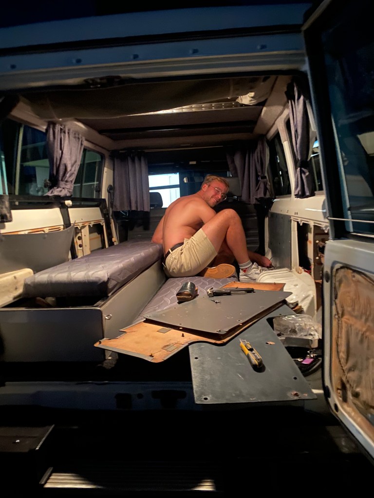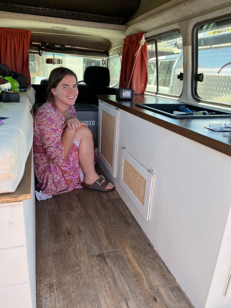 After much consultation with the Instagram troopy influencer gods, we began the fun part of making the troopy ours! The insta gods also blessed Lauren with a desire to use rattan webbing which will be important later! With parental help, we became rookie carpenters and after putting in a vinyl floor, we established a frame for the planned storage side and kitchen. For anyone considering building a troopy, our advice is to maximise storage wherever you can, you will need it! In addition to this, never use barstool chairs as bases to drill wood on as you may end up with unwanted holes in them created by pro carpenters like Steve.